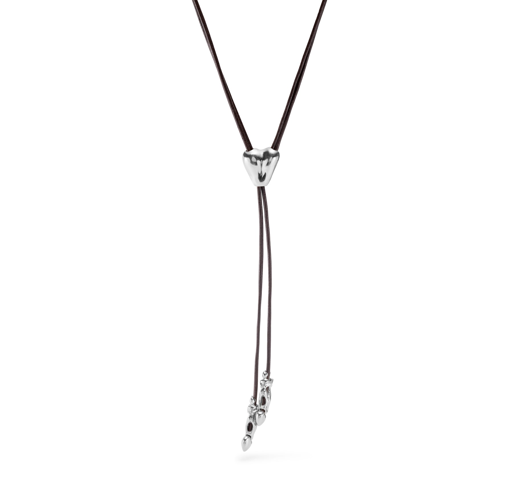 Regular price $252.00 Sale price $152.00 Save $100.00A long leather necklace that features a statement sliding heart, with characters entwined on the ends. Artisan made in Spain this necklace is made from leather, metal alloy casting and silver plating.