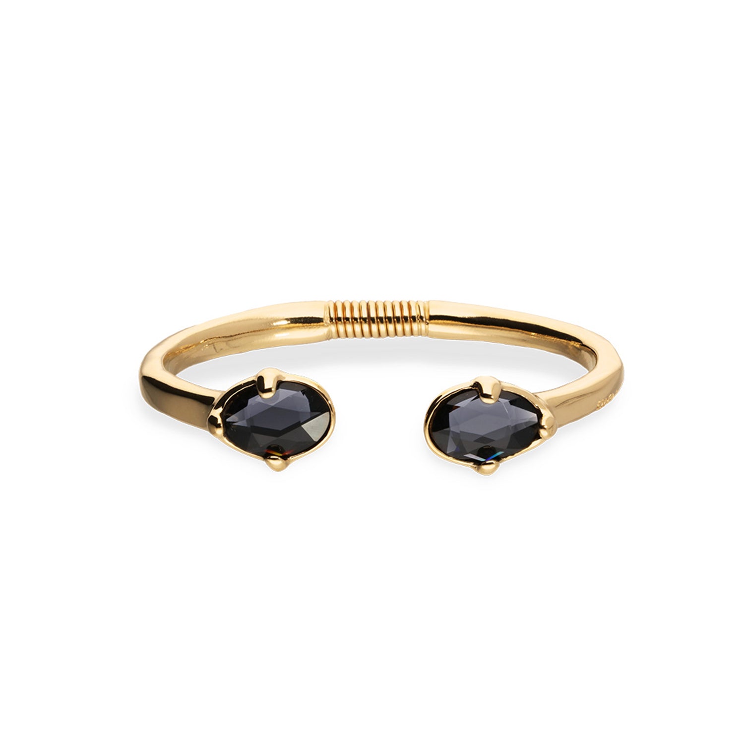18k gold plated alloy open rigid bracelet with spring, adorned with grey faceted oval crystals. A dazzling design that is the perfect combination of power and elegance.