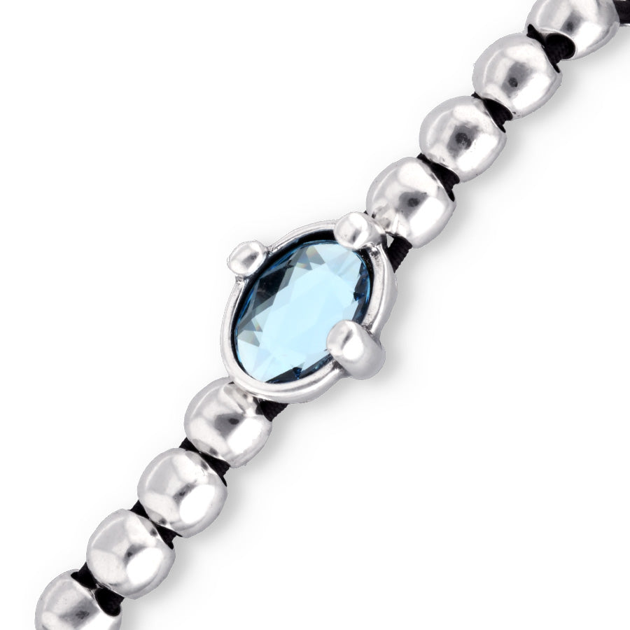 Stretch bracelet with alloy beads plated in sterling silver with bright blue faceted oval crystal. A Dazzling design that is the perfect combination of power and elegance.