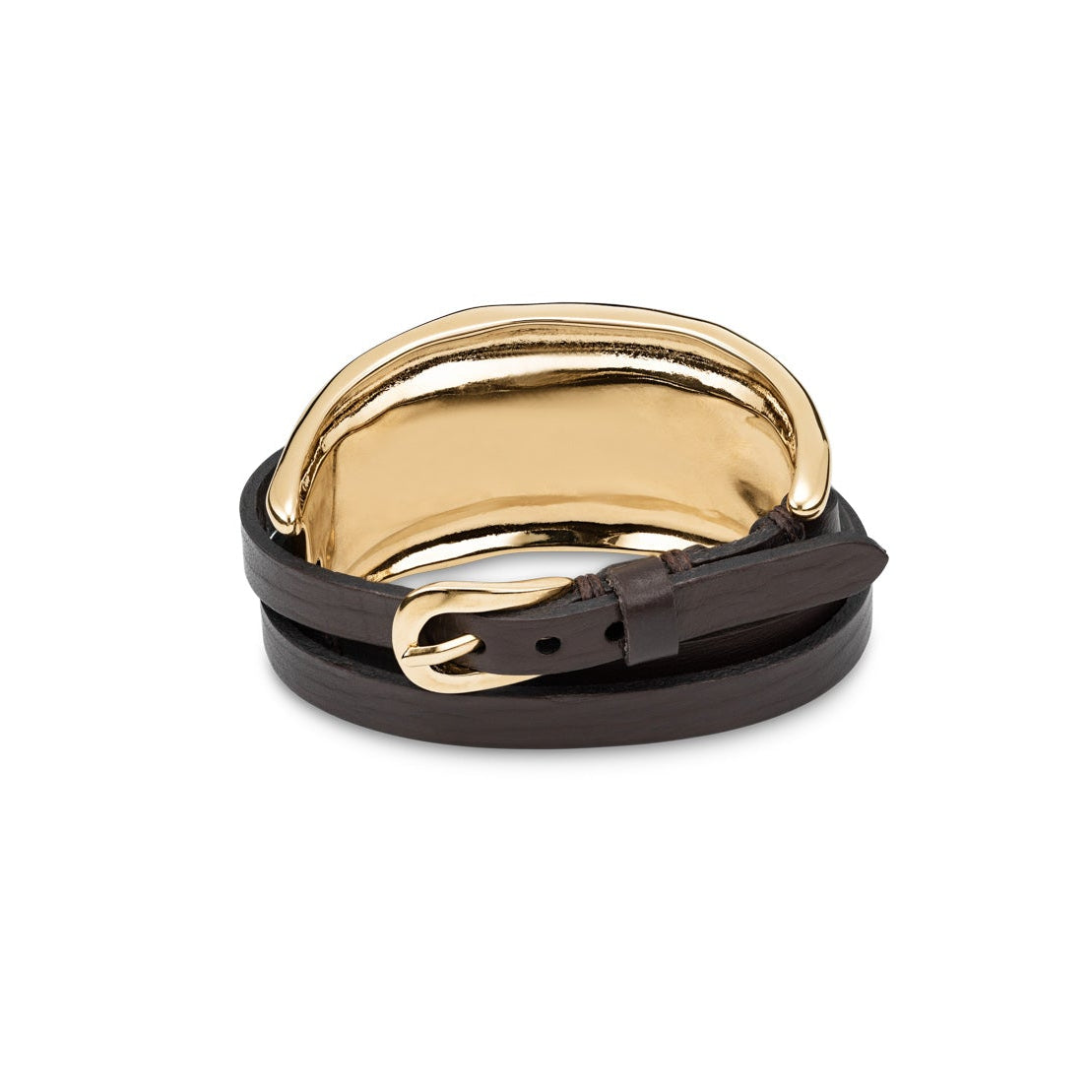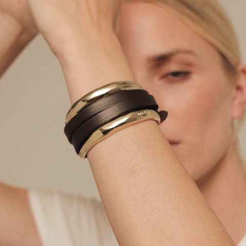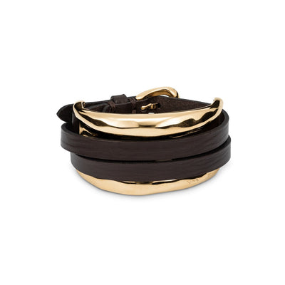 Regular price $601.00The Hold Me Black bracelet is modelled on the iconic Ibiza bracelet but narrower, symbolic of UNOde50 and inspired by the young at heart and Ibizan nights. Its wide cuff design is coupled with a twice-wrapped leather strand ending in a buckle clasp. This piece is handcrafted in a 100% artisan process using a gold-plated alloy. Choose this updated version of an unmistakable UNOde50 classic and make it the key piece of your collection.